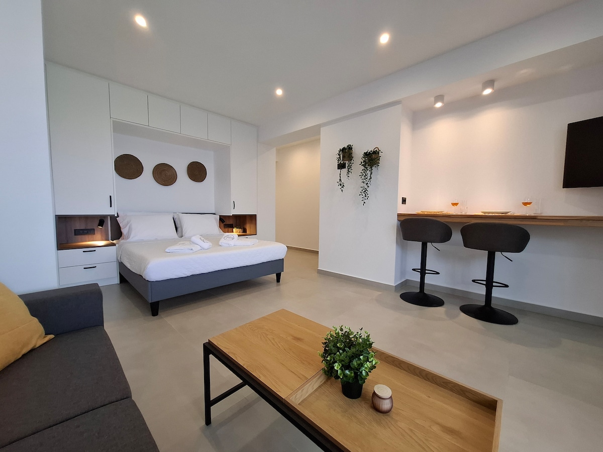 Profitez de la détente ultime dans ce studio élégant et entièrement équipé avec une vue panoramique à couper le souffle sur la mer. L'appartement dispose d'un lit double confortable et d'un canapé-lit, idéal pour accueillir jusqu'à 3 personnes. La cour privée avec un salon extérieur vous invite à déguster votre café ou votre vin surplombant le bleu infini. Idéal pour les couples, amis ou familles à la recherche d'un hébergement de luxe avec confort et style, loin du bruit de la ville.
