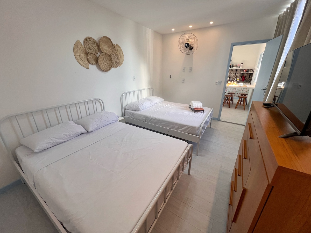 Détendez-vous en famille dans ce logement calme. Notre appartement Parati est au 2ème étage avec 2 chambres, salon, salle de bain et kitchenette équipée, peut accueillir jusqu'à 5 personnes. Espace de loisirs partagé avec piscine, espace enfants, salle de jeux, buanderie et barbecue (sur réservation). Situé à 100 m de la mer, sur la plage de Guanabara. Nous proposons une épicerie exclusive payante et légère pour les voyageurs et une chaise de plage géante pour des photos inoubliables.