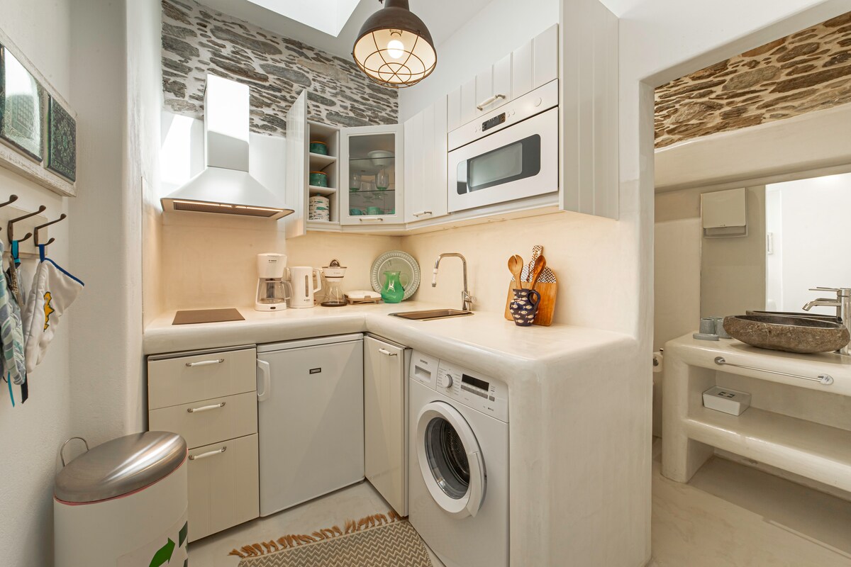 Faisant partie des maisons d'hôtes Andros, ce studio se distingue par un balcon en pierre unique qui offre une vue imprenable sur l'île. Il dispose d'un lit double confortable et d'une cuisine compacte, ce qui en fait un excellent choix pour les amis, les frères et sœurs ou les couples. À seulement 5 minutes des plages de Paraporti et Neiborio, et à proximité de la route centrale de Chora avec boutiques, cafés et restaurants. Situé au deuxième étage, c'est une retraite tranquille à proximité des plages locales, des sentiers de randonnée et des tavernes traditionnelles.
