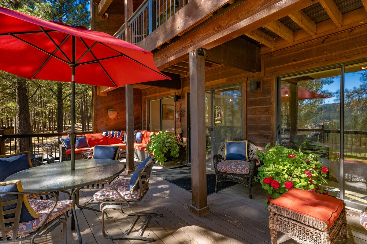 10 Acres | Year-Round Adventures | Dog Friendly w/ Fee This cabin towers above the forest floor, framed by conifers, aspens, and sweeping views of the Moreno Valley, Angel Fire Resort, and the Sangre de Cristos. Inside, the 3-bed + spacious loft, 3-bath cabin pairs lodge-style comfort with mountain luxury. Surrounded by alpine beauty and top-notch resort perks, this retreat invites you to ski fresh powder, fish in the lake, tee off on PGA-rated greens, or bike the acclaimed mountain terrain.