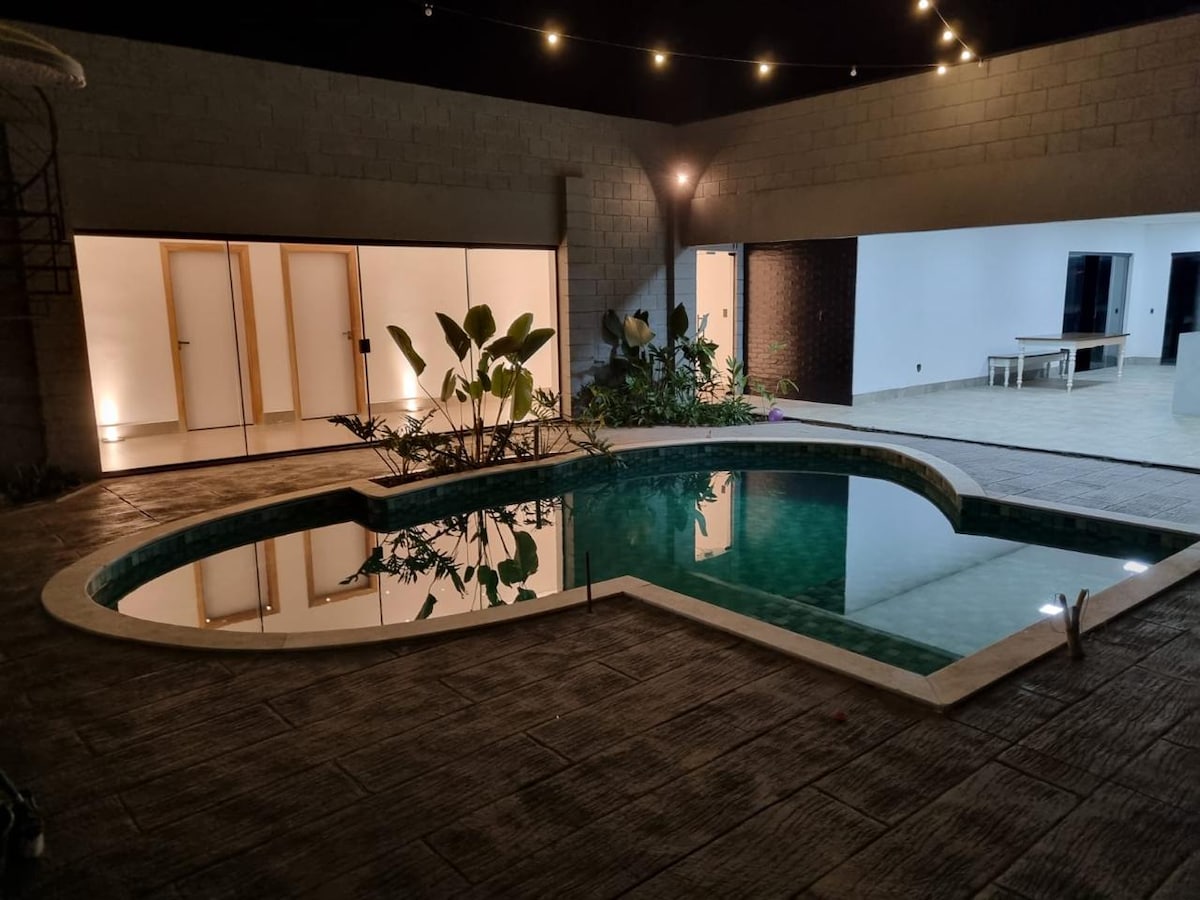 Détendez-vous dans cet endroit unique et calme. 2 suites 2 chambres 2 salles de bains extérieures grande zone de fête cuisine piscine 12 MTS zone entourée barrage dans la rivière rampe pour bateaux et jet ski eau puits artésien, etc. Il dispose de 9 lits simples, 4 lits doubles, 2 lits superposés, 4 matelas simples stratifiés.