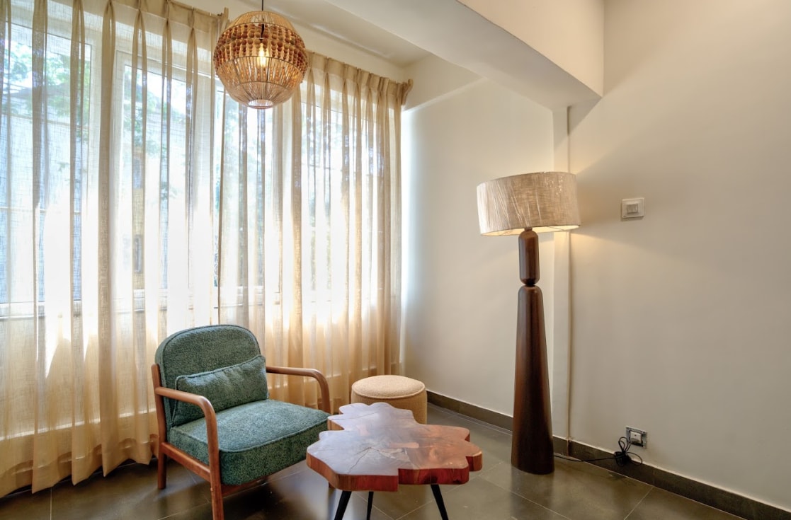 Our Signature Room is a design-forward space featuring a King bed, an open to sky bathroom, and a bathtub blending comfort with thoughtful aesthetics. The room is equipped with high-speed Wi-Fi, air conditioning, and a smart TV for a seamless stay. Located just 1.5 km from the beach and 900 meters from the local market, the property offers easy access while remaining a peaceful retreat. Our spaces are intentionally designed to foster community, creativity, and authentic travel experiences.