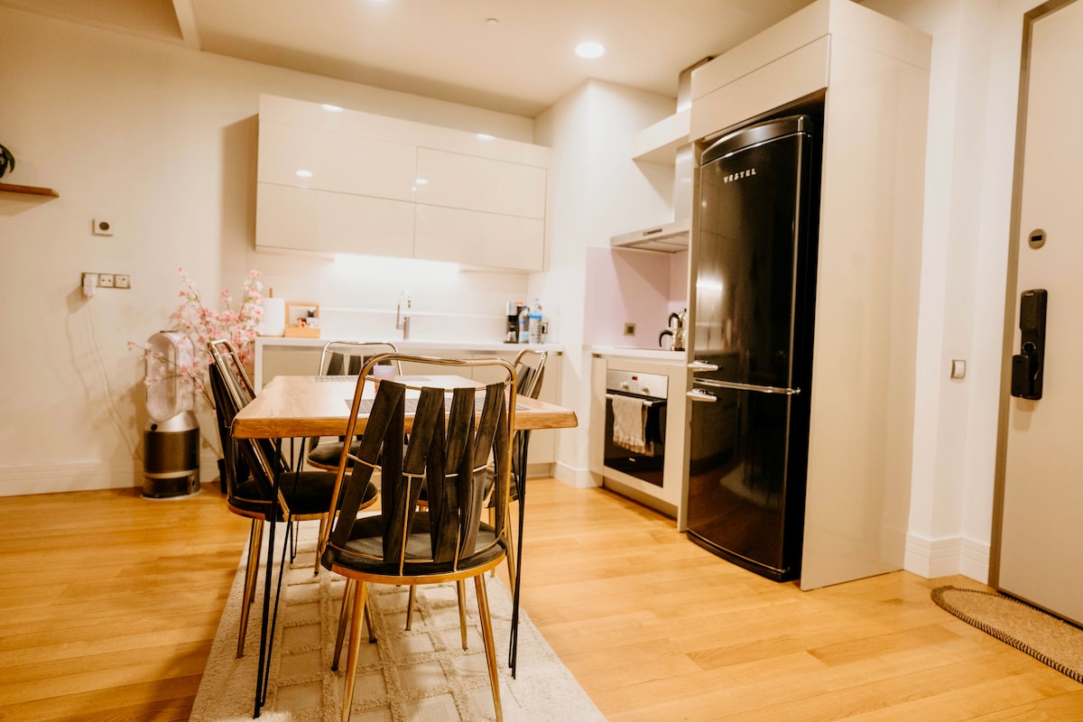 Notre résidence privée, située dans la région la plus élitiste d'Ankara, se trouve à 5 minutes des centres commerciaux Panora et OneTower. Starbucks, Migros, boulangerie... tout ce que vous cherchez est à 1 minute à pied. Vous pouvez entrer et sortir confortablement sans rencontrer personne. Sécurisé Dans cette maison très spécialement décorée, il y a une télévision 58 pouces, une connexion Internet rapide, un lit confortable comme dans un hôtel privé, et la cuisine est entièrement équipée. Dans cette maison où la propreté est la première priorité, vous séjournerez très spécialement avec des collations gratuites.