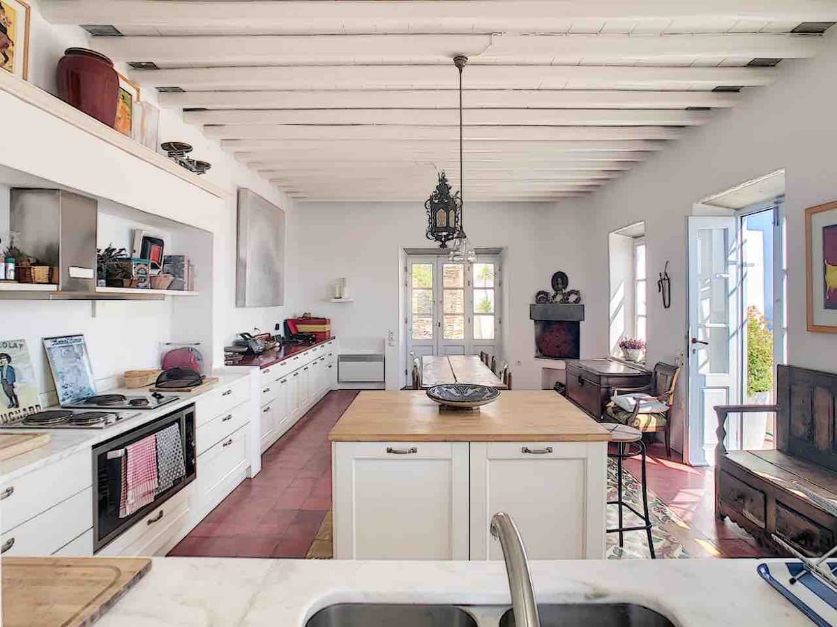 Villa View Détendez-vous surplombant la mer Égée qui s'étend devant vous, ainsi qu'à toutes les colonies centrales de l'île. Avec une vue imprenable et en parfaite harmonie avec l'environnement naturel, vous serez impressionné à la fois à l'extérieur par la couleur blanche traditionnelle de la villa, ses cours et balcons en pierre et ses balcons en pierre et en interne avec ses chambres spacieuses, sa luminosité, son confort et son élégance. Il est idéal pour les familles et les groupes jusqu'à 8 personnes.