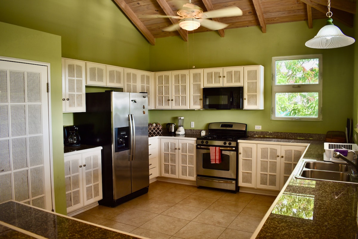 Bienvenue dans notre studio spacieux et accueillant entièrement climatisé ! 🏝️ Offrez-vous du confort avec un lit Queen Size moelleux, un canapé 2 places confortable et une table à manger pour deux. 🛏️Préparez de délicieux repas dans la cuisine entièrement équipée, avec cuisinière/four, réfrigérateur, grille-pain et bouilloire. 🍳 Rafraîchissez-vous dans la douche spacieuse de la salle de bain moderne. 🚿 À l'extérieur, imprégnez-vous des magnifiques couchers de soleil depuis le patio carrelé donnant sur des jardins luxuriants et une vue sur l'océan. 🌅