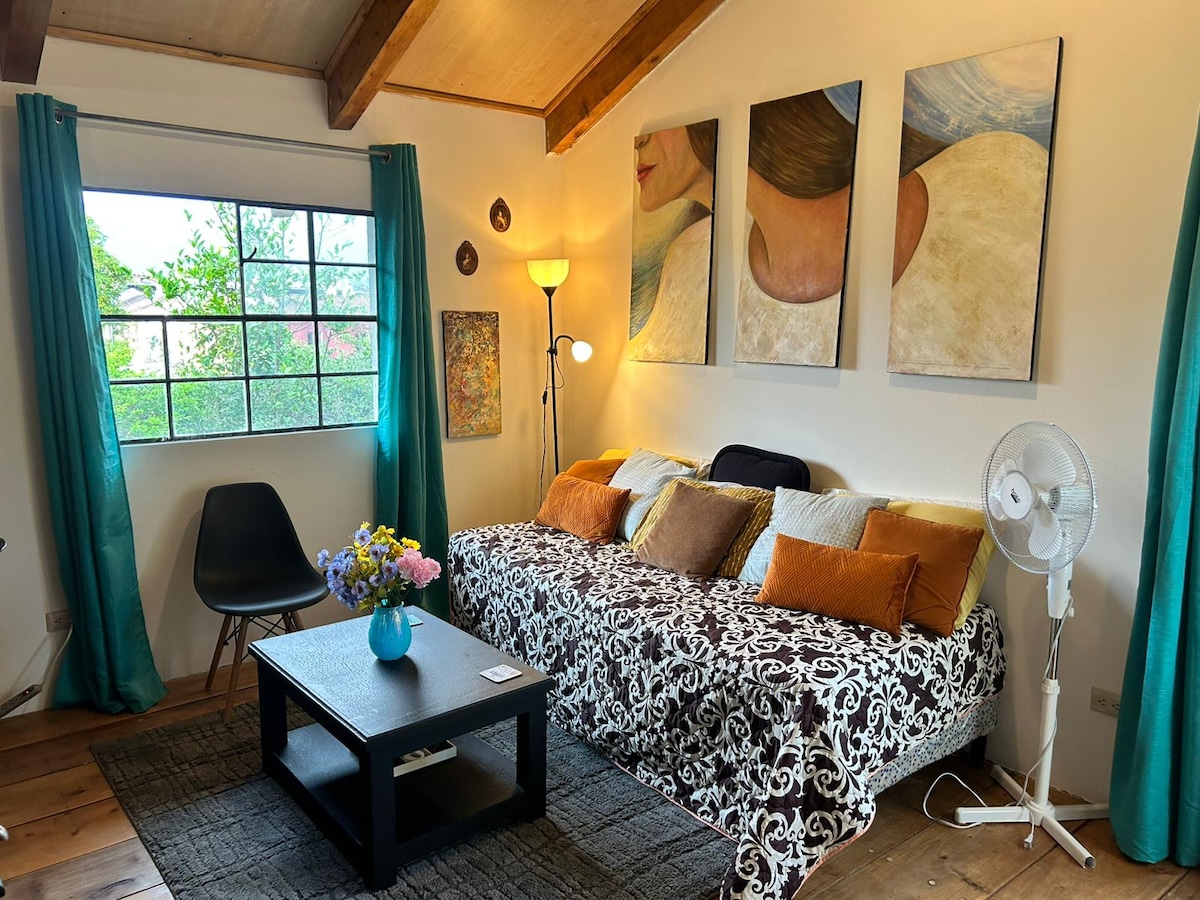 Vive la experiencia de hospedarte en el corazón de La Antigua Guatemala. A solo unas cuadras del parque, recorre estas mágicas calles a pie. Con muchos restaurantes, bares y atrcciones a solamente unos pasos pero lo suficiente como para mantenernos privados del ruido nocturno. Es un espacio acogedor diseñado para 2 personas, con todo lo necesario para estadías largas y cortas en un vecindario precioso y súper seguro. No contamos con parqueo privado y debes de subir unas gradas al llegar.