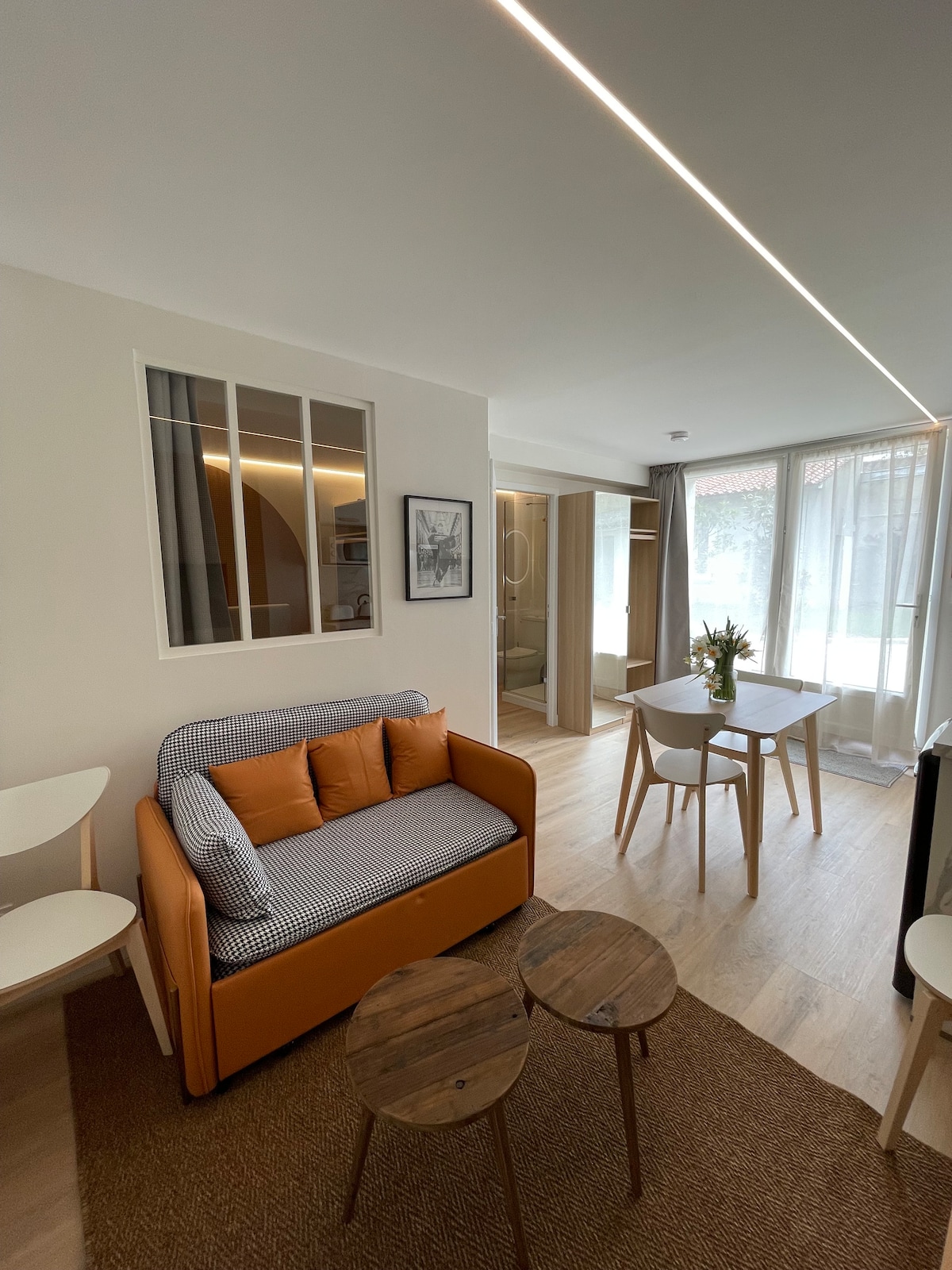Idéalement situé à 200m de la place François 1er, cœur emblématique de Cognac, ce studio allie élégance et confort. Son espace nuit dispose d’un lit 160x200 avec un matelas haut de gamme pour des nuits tout en douceur. La pièce de vie, au design sobre et raffiné, intègre un espace repas et une cuisine fonctionnelle, créant une atmosphère chaleureuse. Le stationnement est gratuit dans la rue au pied de l’immeuble. Un cadre idéal pour profiter pleinement de votre séjour à Cognac.