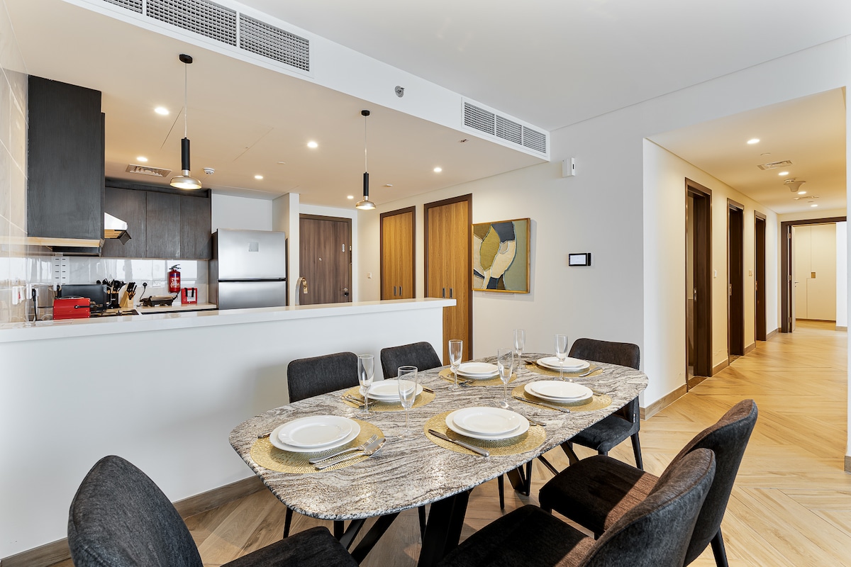 Bienvenue dans votre séjour luxueux à Doha • Emplacement privilégié dans le quartier Pearl. • Salon et salle à manger lumineux et spacieux avec un balcon donnant sur la ligne d'horizon de Doha. • Cuisine américaine entièrement équipée avec appareils électroménagers. • Trois salles de bains (deux avec douches). • Deux chambres spacieuses avec lits King Size (4 places de lit + canapé + matelas). • Grand balcon avec barbecue. • Rideaux occultants motorisés. • Accès à la salle de sport, à la salle de jeux pour enfants, au sauna à vapeur et à l'espace social avec table de billard, etc. • Accès privé à la plage et à la piscine.