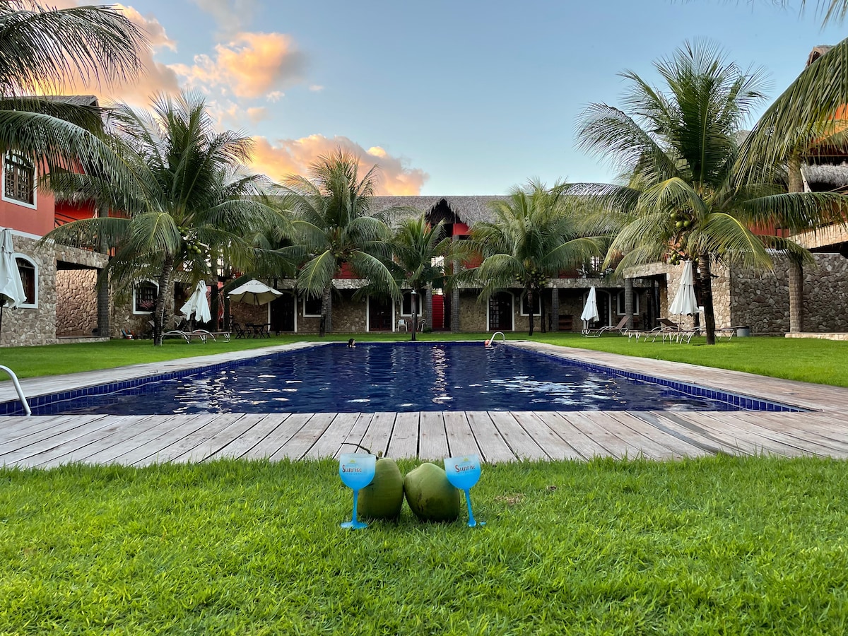 Chalé avec vue sur la piscine, situé à 400 mètres de la plage et à 700 mètres de Broadway (la rue la plus célèbre de Canoa Quebrada) Situé dans une copropriété résidentielle, qui dispose de 2 piscines, d'un concierge 24h/24, d'une place de parking couverte pour les petites voitures (ROTATIVE) et d'une connexion Wi-Fi gratuite. Le chalet à l'étage supérieur, c'est-à-dire qu'il y a une échelle à monter, peut accueillir de 1 à 6 personnes, avec climatisation, réfrigérateur, cuisinière, ustensiles de cuisine, télévision, literie et salles de bains inclusives.