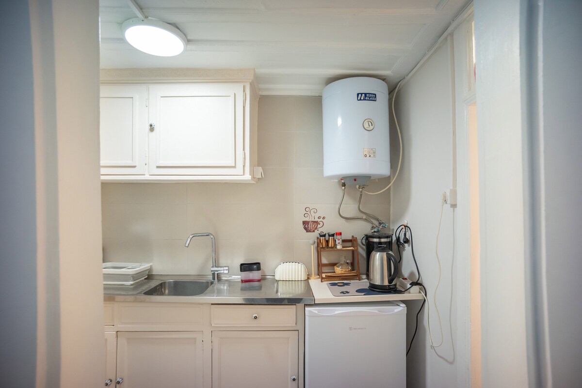 Studio de luxe avec kitchenette, salle de bains et patio privé. Fait partie d'un ancien manoir construit au XVIIIe siècle. Récemment rénové afin qu'il puisse confortablement accueillir jusqu'à quatre personnes. En plein centre de l'île de Spetses. À cinq minutes à pied du port principal. À cinq minutes à pied de la plupart des attractions (marché principal, restaurants, bars, musées, plage d'Agios Mamas).