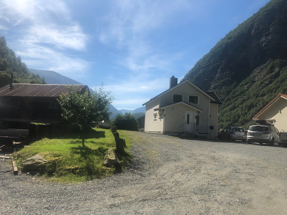 Koselig ,gammelt restaurert hus i utladalen øvre Årdal på gårdstun til vert leies ut; kjøken, stove, bad, 3 soverom med 4 dobbeltsenger (og babyseng). Grillbord og bålpanne kan benyttes i Hagen. Leikeapperat for barn i hage samt dyr i tunet. Huset ligg ved inngangsporten til Jotunheimen nasjonalpark (vettisfossen) og kunn nokre km fra Sognefjorden. Her kan du bla få guida fjellturer i praktfull natur eller fjordsafari med kajakk Flott badeanlegg i sentrum 4km fra huset