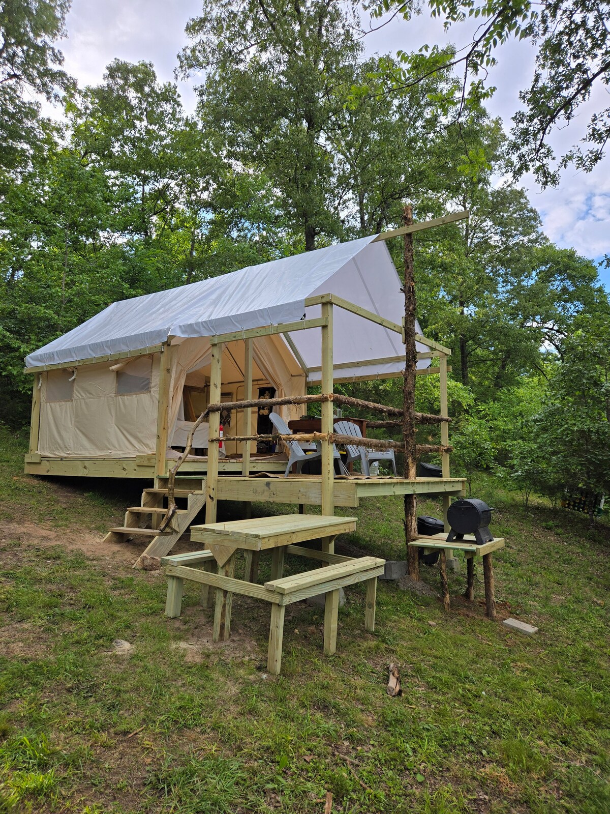 Lakeside Glamping — une retraite paisible à seulement 3 minutes de Prairie Creek Marina, à 15 minutes du centre-ville de Rogers et à 25 minutes de Bentonville. Cette tente confortable comprend : Matelas ⭐️Queen Helix avec mousse à mémoire de forme et ressorts ⭐️Mini réfrigérateur + petit congélateur (apportez une glacière pour les extras) ⭐️Nespresso Vertuo avec 4 capsules (plus dans le magasin du camp) ⭐️Chauffage et climatisation via un système split sans évacuation ⭐️Douche à quelques pas (pas de salle de bain dans le logement)