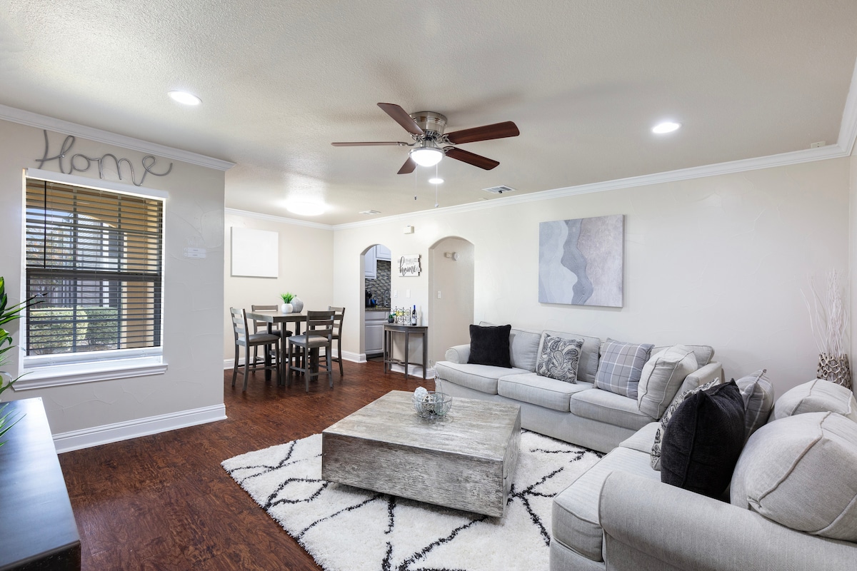 La GreenHouse est composée de 3 chambres et 2 salles de bain pour accueillir un maximum de 8 voyageurs. À environ 1/2 mile ou 12 minutes à pied de l'AT&T Stadium. Nous avons du plaisir pour tout le monde avec 5 lits et beaucoup de jeux pour vous divertir toute la nuit. Cuisine entièrement approvisionnée et barbecue à gaz extérieur pour cuisiner et profiter de notre climat texan. Petite table à manger à l'intérieur pour 3 mais grande table à l'extérieur ! Foyer, jeu de sacs et Connect4 avec parking clôturé. Nous vous souhaitons un excellent séjour dans cette maison à Arlington au Texas !