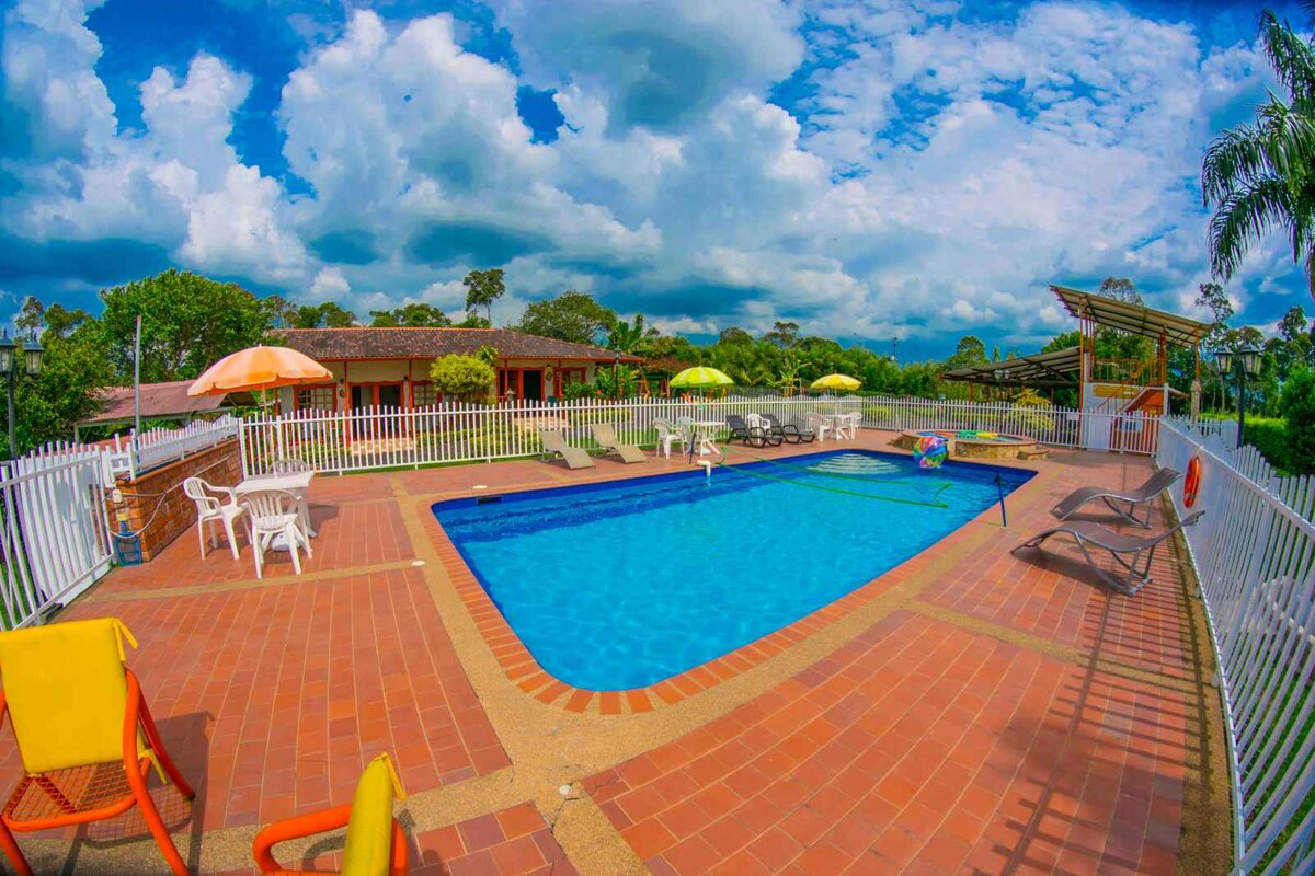 Chambre située dans le domaine hôtelier de l'Alto Bonito, adaptée pour un groupe de 5 personnes, avec l'avantage que nous sommes situés à 10 minutes de l'Arménie et à 15 minutes du Parque del Café, un endroit typique dans la région du café. Le petit déjeuner est inclus, sans frais supplémentaires. Nous avons une salle commune avec table de billard, piscine commune, salle de bain privée et TV.