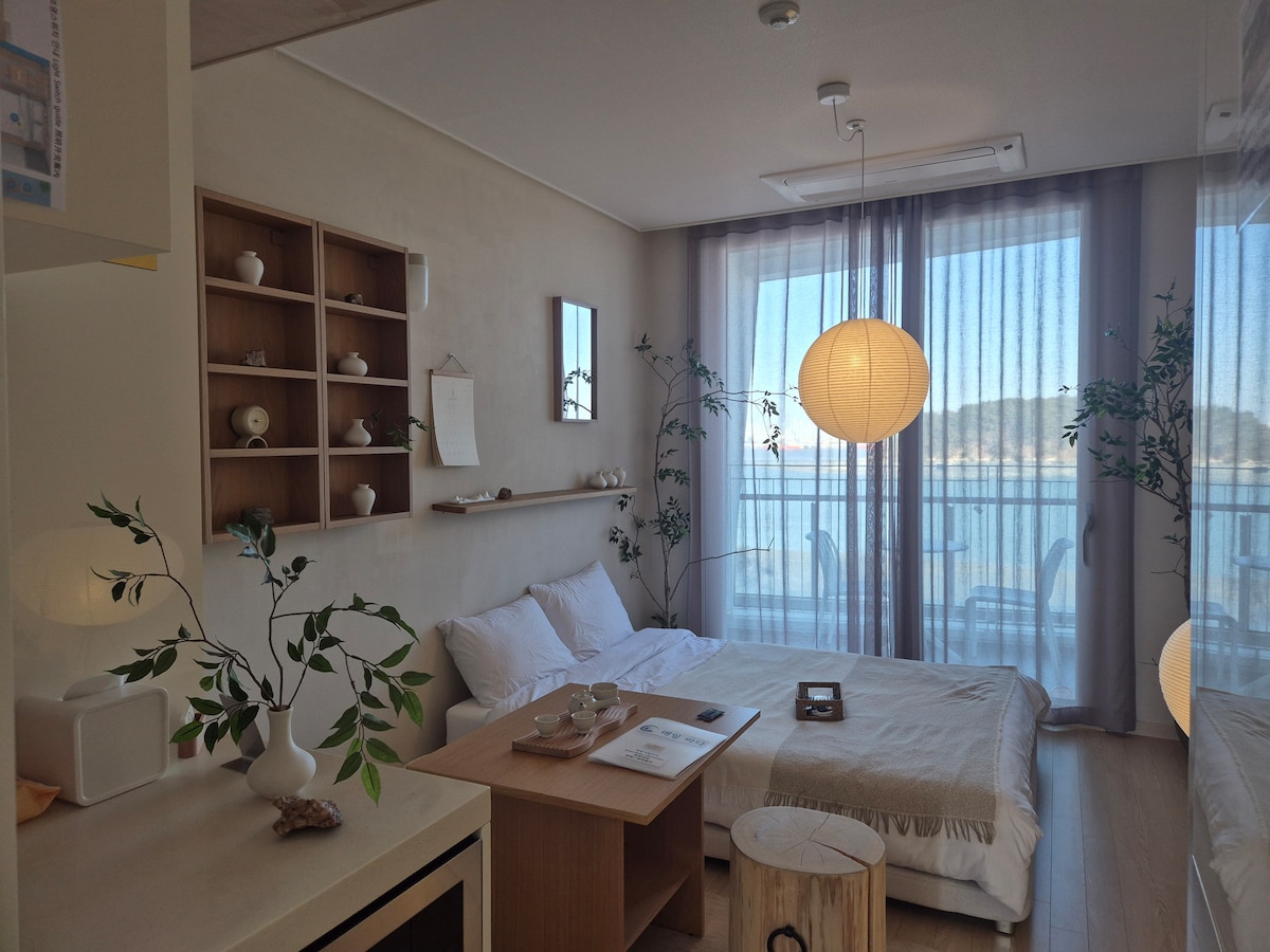 La mer face à Jukdo, le sanctuaire du surf ! 30 secondes à pied, Allongez-vous sur le lit et ouvrez le rideau pour profiter du bruit des vagues et du lever du soleil, et ressentez le café et le scintillement éblouissant des vagues sur la terrasse. Les vagues calmes et la brise marine rafraîchissante Profitez d'un refuge sur une plage enchanteresse. C'est un hébergement paisible, et le littoral naturel que vous pouvez voir en vous asseyant sur le lit et en tirant simplement les rideaux offre une vue incomparable. Il est directement relié à la plage ensoleillée, qui n'est qu'à quelques pas du hall. Pour ceux qui recherchent la paix, le repos dans cette chambre Moka préparée en gardant le repos à l'esprit Vivez vos vacances. Pendant ce temps Votre propre chemin, à votre propre rythme pas à pas, naturellement avec votre propre chemin et votre propre rythme !!! C'est une chambre simple et élégante où vous pouvez accueillir des changements comme des vagues et des lendemains éblouissants comme l'océan après avoir été ici avec vous.