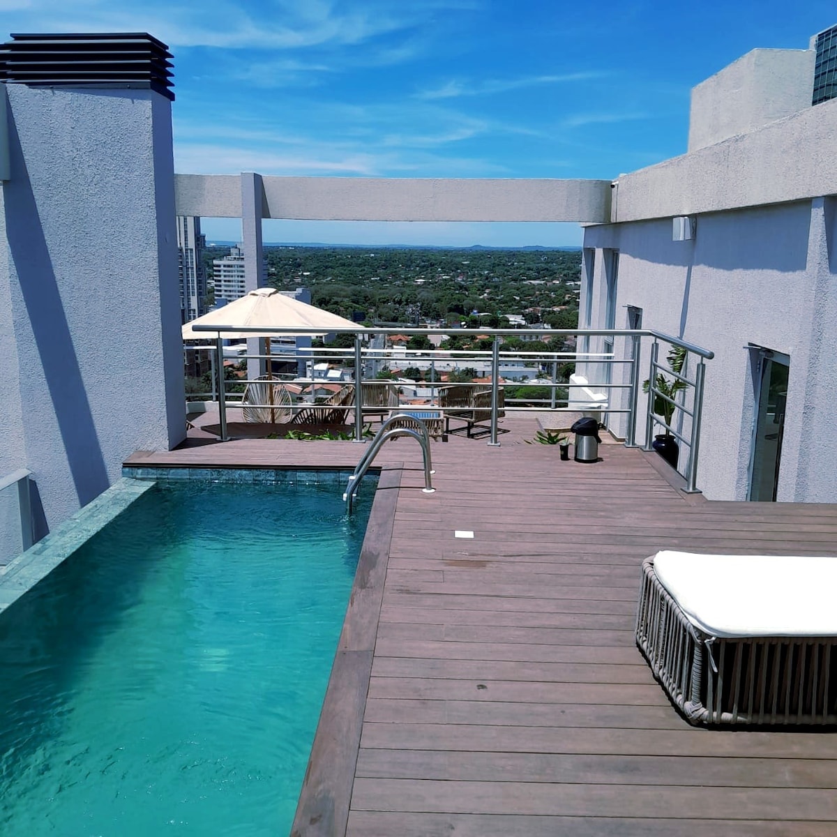 Séjournez dans le meilleur quartier d'Asunción, à quelques pas du Paseo La Galería et du Shopping del Sol. Cet appartement de luxe au 15e étage offre une vue panoramique, un lit queen-size climatisé, une télévision NeoQLED 65" avec système audio et une cuisine entièrement équipée idéale pour les longs séjours. Profitez d'un accès au spa avec sauna, jacuzzi, salle de massage, piscine sur le toit, salle de sport, espace de coworking, salon de lecture, salle de jeux, espace barbecue, parking avec voiturier et sécurité 24h/24 et 7j/7 dans un immeuble haut de gamme.