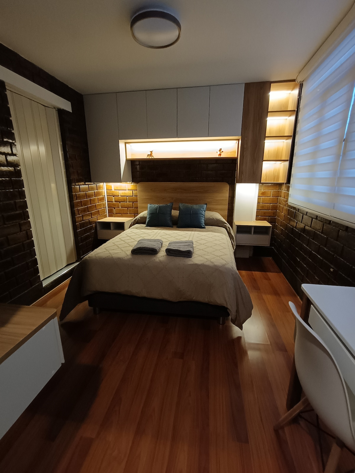 Mini depa completamente amoblado en segundo piso (escaleras), habitación y baño extra grandes, Cama King y sofá cama en un mismo ambiente, closet amplio. Wifi fibra óptica, Smart TV 70” con XuperTv. Cocina equipada y comedor. Cerradura inteligente. Hermosa vista al jardín y parque. Piscina de uso compartido. El vecindario es residencial, seguro y tranquilo con vigilancia privada, hay banco, bodegas y lavandería. Hacemos cambio de sábanas y toallas, gratis después de cada semana de estadía.