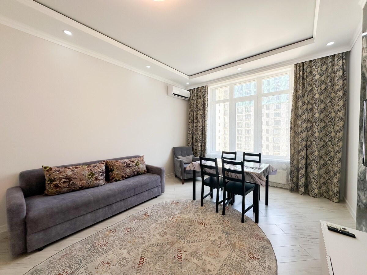 2 pièces dans le complexe résidentiel « Zaman » Business Class, 2021 💫 4 lits : lit double + canapé-lit, lit double complet. 💫 Wifi illimité 💫Smart TV, Alma TV, câble. 💫 Une cuisine avec un ensemble de cuisine complet et des ustensiles. 💫Près du centre commercial Baizaar, de l'hôtel Renaissance, du bureau du TCO. 💫 Nous fournissons tous les documents nécessaires pour vous et votre entreprise. 💫 Interdiction de fumer dans l'appartement, pas de bruit la nuit de 22 h 00 à 9 h 00, pas d'animaux de compagnie !