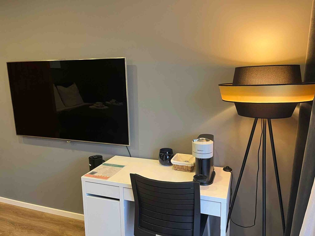 Top Suite 35 m ² Augsburg Central Congress Hall Points forts : Lit à ressorts king size 180*200 cm - hauteur individuellement réglable Télévision Neo-QLED 55 pouces avec Netflix. Internet 100 K pour le streaming et le bureau à domicile. Kitchenette complète avec ustensiles de cuisine et d'épices. Salle de bain avec miroir LED et douche à l'italienne 22e étage de la tour de l'hôtel avec vue large et balcon. À distance de marche : gare principale, centre-ville, Wittelsbacher Park. Daniel et Stefan sont prêts pour vous aider