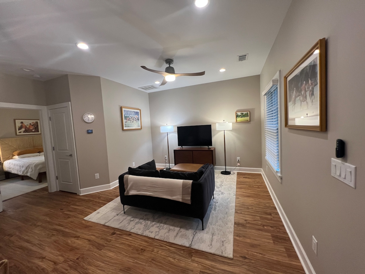 Bright, charming 408 sq ft studio apartment with a queen bed, work desk, lounge chair/ottoman, 3 piece private bathroom and kitchenette (sink, mini frig. & microwave). Also includes a dedicated closet, well stocked coffee station, smart TV, luggage rack, full sized ironing board and blow dryer. Windows and french doors offer roman shades with blackout panels for privacy. Access to a outdoor fire pit seating area is also included. Convenient to local attractions in Aiken, SC and Augusta, GA.