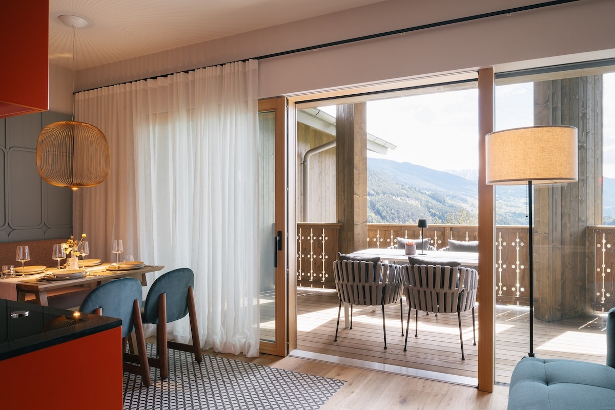 Appartement avec une chambre séparée avec vue sur les montagnes ou vue sur la vallée jusqu'aux Dolomites. Balcon ou terrasse avec vue sur les montagnes ou sur la vallée vers les Dolomites / salon / TV LED HD / cuisine de marque entièrement équipée / une chambre avec lit King Size / salle de bain avec douche, WC et bidet / Wi-Fi haut débit / 32-38 m² / 1-2 personnes. SPA : bain de vapeur, sauna finlandais, sauna bio, piscine d'eau froide, espace détente, bain à remous XXL à débordement, piscine. CrossFit Box – Gym.