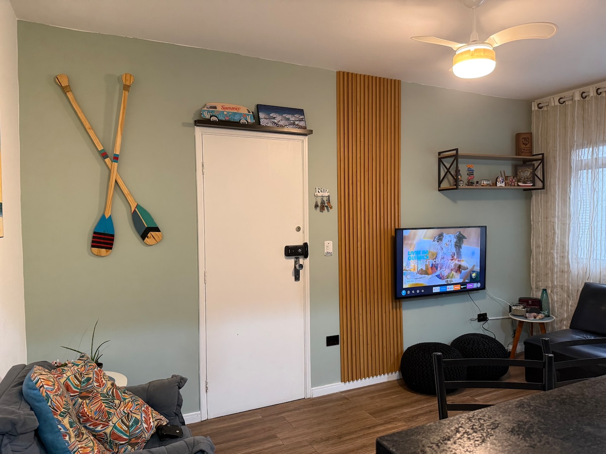 Apartamento UMA QUADRA DA PRAIA do Canto do Forte com ar condicionado no quarto ( é difícil encontrar apartamento na região com ar condicionado), Wi-Fi e tv smart 32 polegadas. Temos um cantinho para seu home office!!! No apartamento você encontra tudo que precisa para ter uma estadia perfeita. Apartamento limpo e muito aconchegante!!! Leia as avaliações de quem já esteve em nosso apartamento. Vem aproveitar sua estadia!