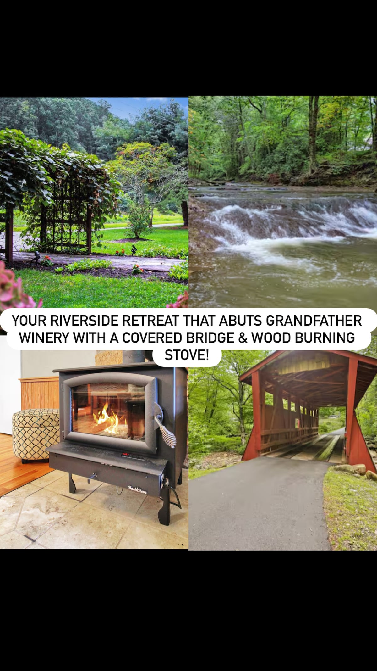 Vacances sur la rivière, dans les montagnes de la Caroline du Nord. Suite entièrement meublée isolée dans une maison privée située sur la rivière Watauga à la confluence de Beech Creek. Une chambre avec un lit Queen Size, deux lits XL et un lit Murphy. Une salle de bains avec baignoire et douche. Séjour avec cheminée à gaz, lave-linge séchant et cuisine entièrement équipée. Portes vitrées du sol au plafond sur deux côtés permettant une vue complète sur la rivière et le ruisseau. Immense terrasse avec tables et chaises qui comprend un barbecue et un foyer au gaz. ANIMAUX acceptés.