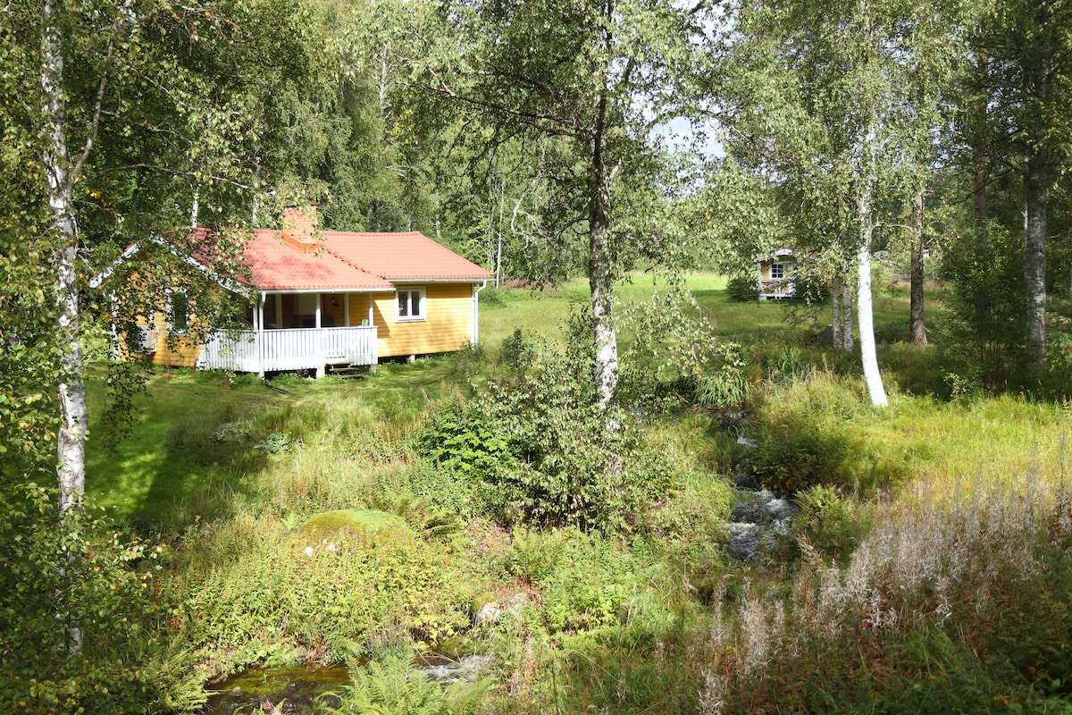 Venez vous détendre dans cette maison jaune paisible et confortable ! Entouré par la forêt et avec un ruisseau qui court à deux pas. Une promenade de 15 minutes (900 m) vous emmène à un magnifique lac de baignade avec une eau incroyablement claire. Nous sommes Malin et Woody et vivons à côté dans une petite ferme. Nous avons trois enfants, deux chats, un chien et un groupe de canards. Selon la saison, il est possible d'acheter des œufs de canard et des légumes biologiques directement dans le jardin ! Vous trouverez également un sauna chauffé au bois à côté de l'étang.
