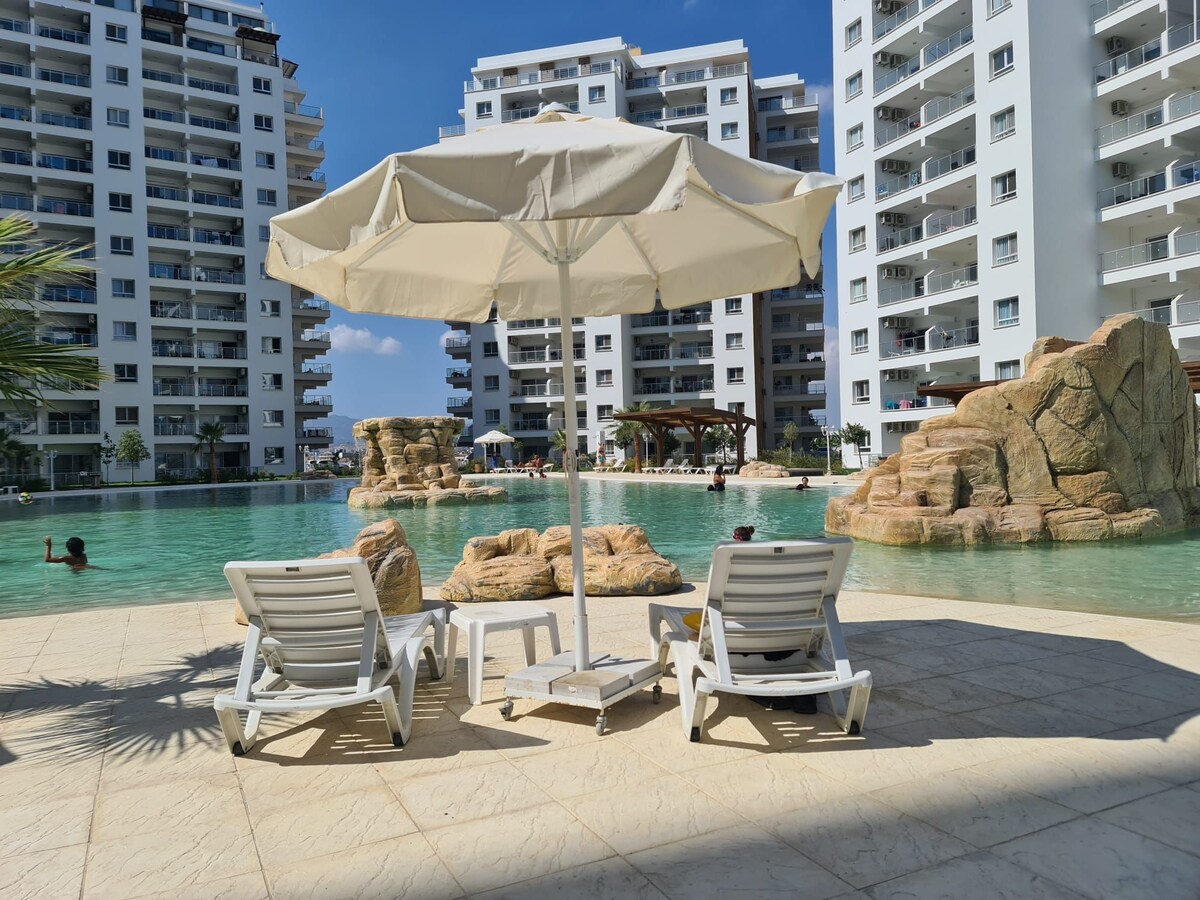 Просторная современная квартира в минуте от аквапарка и 7 минутах пешком от чистого песчаного пляжа. Аквапарк, бассейны и вся остальная инфраструктура комплекса, включая зонтики и лежаки на пляже бесплатны для использования. В жилом комплексе есть магазин, ресторан, кафе, пекарня, пиццерия, спортзал, детские площадки, большая детская игровая комната, несколько бассейнов, крытый бассейн с сауной и хаммам, зона BBQ, охрана 24/7. Тихий живописный район, поблизости множество достопримечательностей.