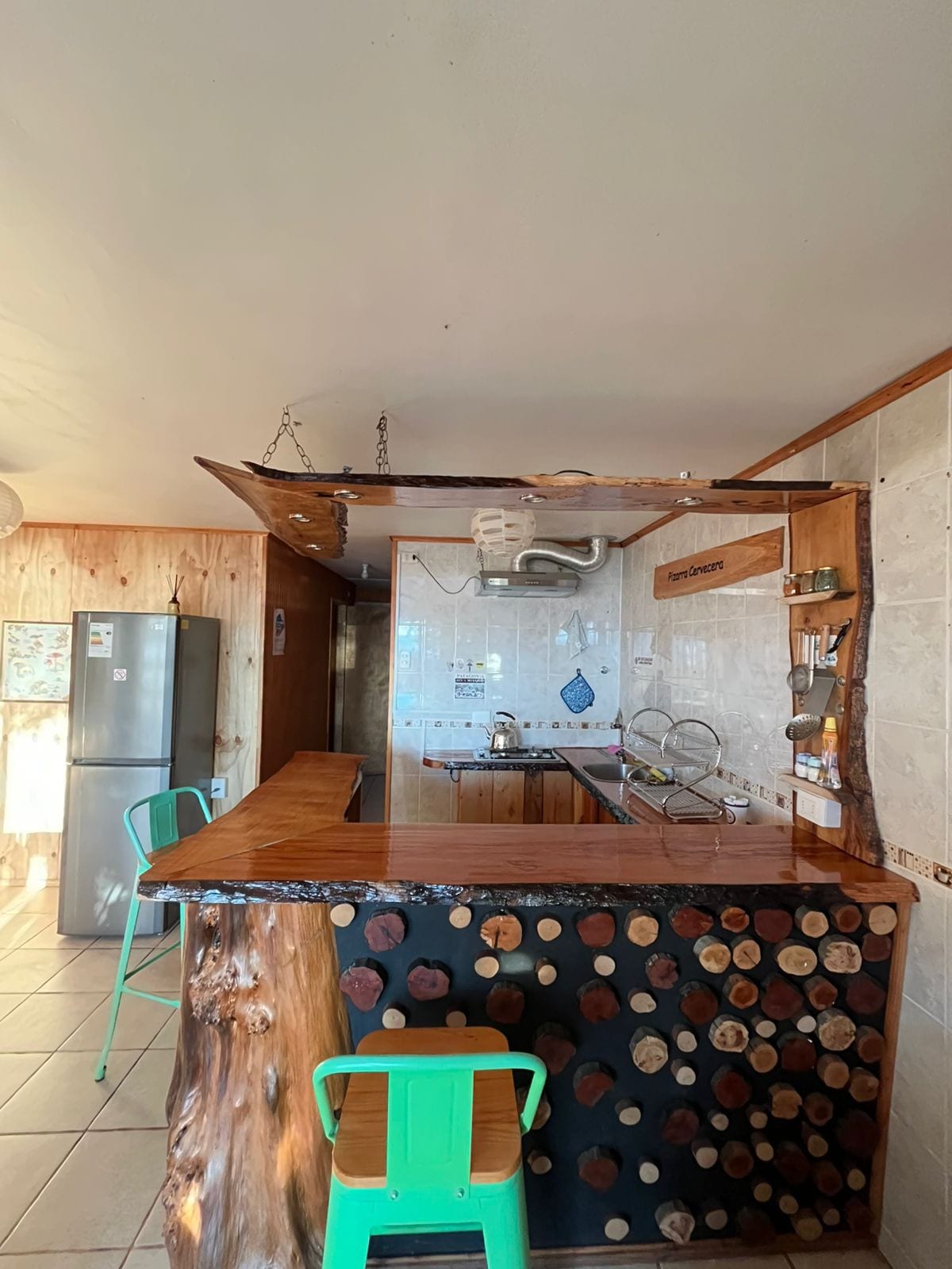 Belle cabane -Martin Pescador- en bois de 55 m² avec 2 chambres, une avec un lit double de 2 places et une autre avec un lit d'une place et demie plus un lit gigogne d'une place. Chauffage avec radiateur électrique et chauffage supplémentaire à granulés central. Grande salle de bain avec lave-linge inclus. Cuisine équipée et réfrigérateur. Excellente construction avec isolation thermique, plancher en bois et toutes les fenêtres en panneau thermique. Possibilité d'un excellent petit déjeuner pour 7 500 pesos chiliens p/p.