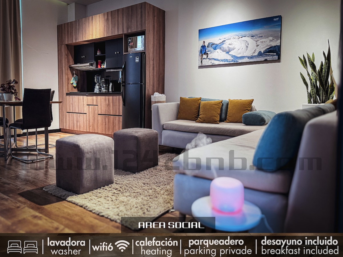 Elegant loft with quality finishes, perfect for executives/travelers seeking maximum security and comfort. Near Quinta Lucrecia, Mall del Río, Supermaxi. Includes: -Daily Gourmet Breakfast (fresh juice, 2 eggs, toast). Served at your door (8-10 am). Not available on Sundays -WiFi 6. -Secure Garage. -Smart locks, 65" Smart TV, electric fireplace. -Courtesy: Towels, shampoo, body wash. -Premium location, comfort, and security guaranteed! (Please avoid using towels for makeup removal).