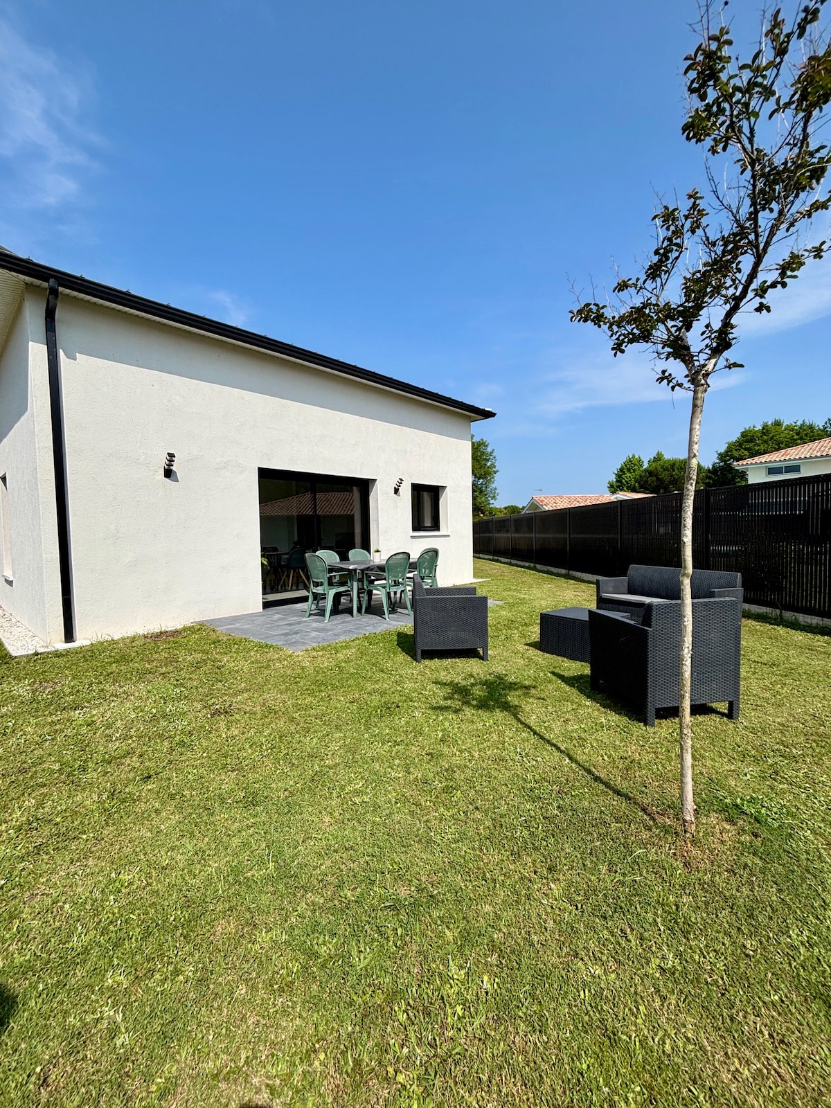 Cette maison bioclimatique contemporaine dans la verdure n'a été construite qu'en 2021. Elle est située dans un environnement totalement calme. Dans le même temps, elle est située non loin des plages. Le salon spacieux s'ouvre sur une terrasse en bois de 50 m2 et un jardin avec une vue panoramique imprenable. Disponible toute l'année et également pour des séjours longue durée. Internet par fibre optique disponible pour le télétravail.