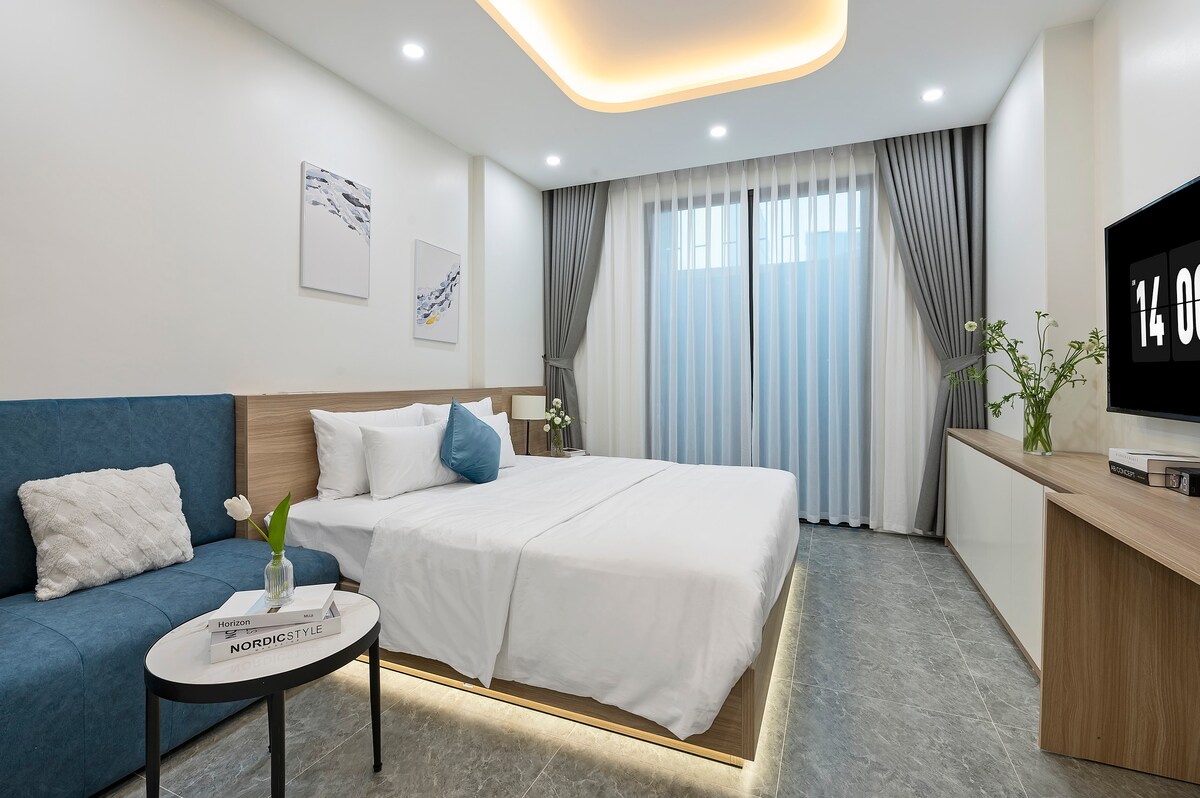 The Harmony, 343 An Duong Vuong, Tay Ho, Hanoï. Chambre studio privée, moderne, chaleureuse et privée. L'emplacement est proche de West Lake, à proximité d'un café et d'un restaurant dans la région. Bonne sécurité, espace confortable, équipements complets : ascenseur, parking gratuit pour les motos. La chambre dispose de : lit King Size, wifi rapide, climatiseur bidirectionnel, minibar, télévision (Netflix), kitchenette avec ustensiles de cuisine de base. Arrivée/départ anticipé/tardif sous condition (en supplément). Exigences : photo de votre passeport/visa ou de votre pièce d'identité vietnamienne pour l'enregistrement de résidence temporaire.