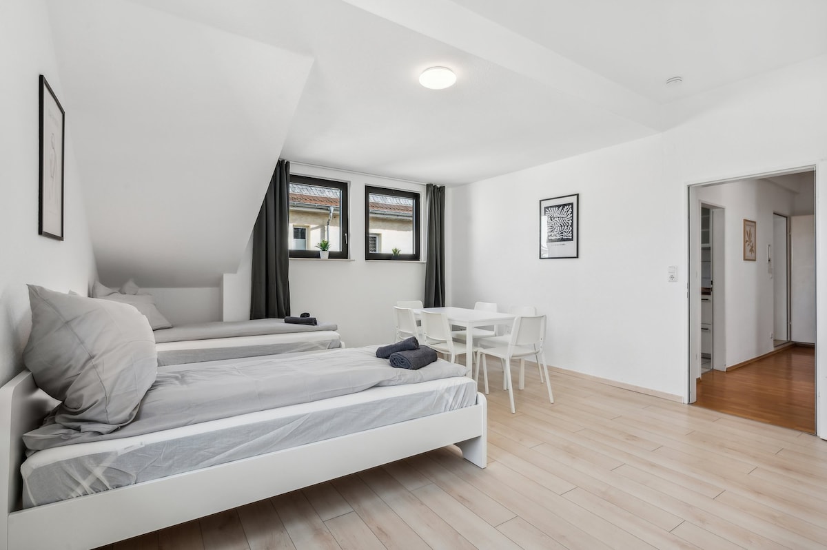 Appartement en duplex lumineux et moderne au 3ème étage (sans ascenseur) dans le centre de Bad Vilbel. Francfort-City et Messe sont rapidement accessibles – idéal pour les navetteurs, les voyageurs d'affaires et les visiteurs de la foire. Sur deux niveaux avec un plan d'étage spacieux. Entièrement meublé (cuisine, machine à café, machine à laver, wifi). Calme malgré l'emplacement central. Transports en commun et shopping à pied. Emplacement de stationnement privé, inclus dans le loyer. En quelques minutes en train, en bus (devant la porte) ou en voiture vers Francfort, la foire et l'aéroport.