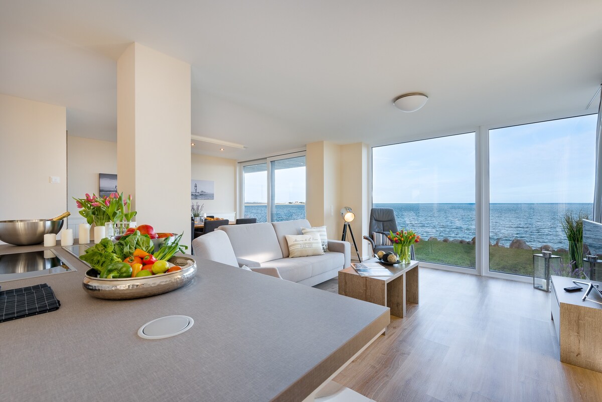 La maison de vacances moderne et meublée de haute qualité Strandblick est située directement sur la plage de sable et la baie de baignade de la station balnéaire d'Olpenitz et offre des vacances à la plage avec des accents réussis.