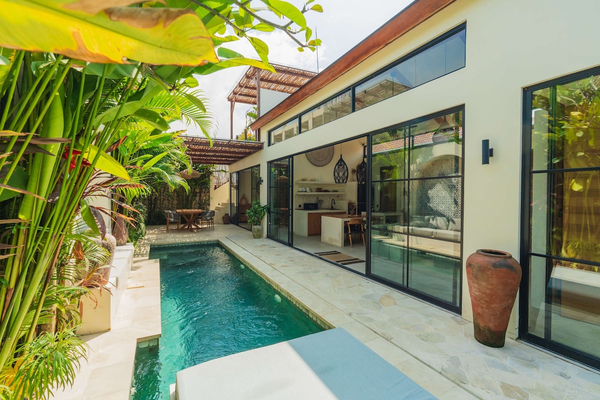 Bois chaud. Une cour ouverte. Une villa de deux chambres construite autour d'une piscine centrale, où chaque espace est tourné vers l'intérieur et les distractions restent à l'extérieur. Les matins sont paisibles, les après-midis restent ombragés et les soirées s'installent naturellement à mesure que la lumière s'adoucit dans la cour. Situé à Kerobokan entre Seminyak et Canggu, les cafés et les plages sont à environ 10–15 minutes en scooter. Et une fois que vous êtes de retour, tout reste tranquillement centré.