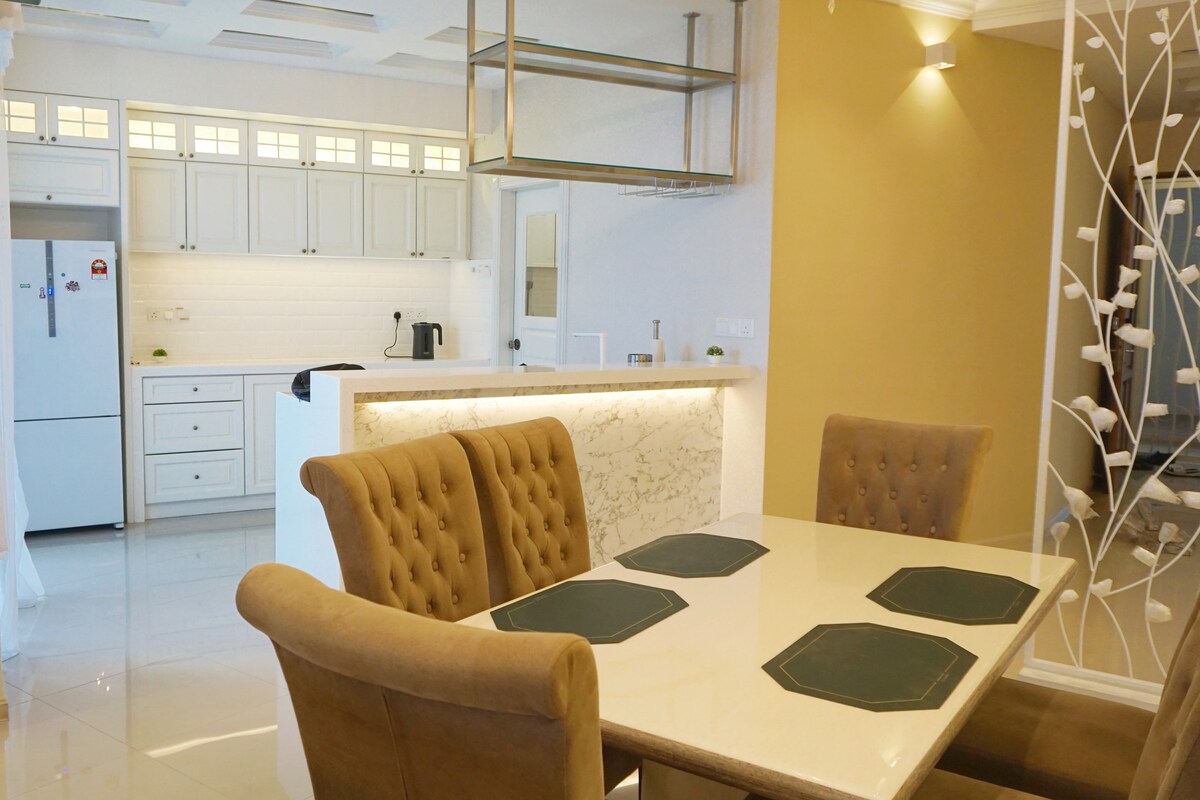 Profitez du séjour dans un nouveau condominium de style français moderne ! NOTRE LOGEMENT est à proximité de divers équipements et commodités. University Sains Malaysia, Sekolah Kebangsaaan Minden Heights et le Penang Sports Council sont également à proximité. Le célèbre pont de Penang à 2 minutes. Notre logement peut accueillir CONFORTABLEMENT jusqu'à 7 PERSONNES ! Cet appartement design meublé dispose de 3 chambres et 3 salles de bain avec un design intérieur d'inspiration MODERNE. CONVIENT AUX voyageurs d'affaires, de loisirs ou de famille.