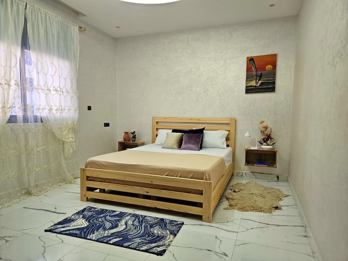 Kite, chill, repeat — and do it in style. This modern 2BR designer apartment is your perfect base in Dakhla. Just minutes from the lagoon, it offers bright rooms, a fully equipped kitchen, fast Wi-Fi, and a cozy living area. Ideal for kitesurfers, couples, or remote workers. Walk to cafés, markets, and beaches. Relax in comfort after a day of wind and waves. Your Dakhla escape starts here!