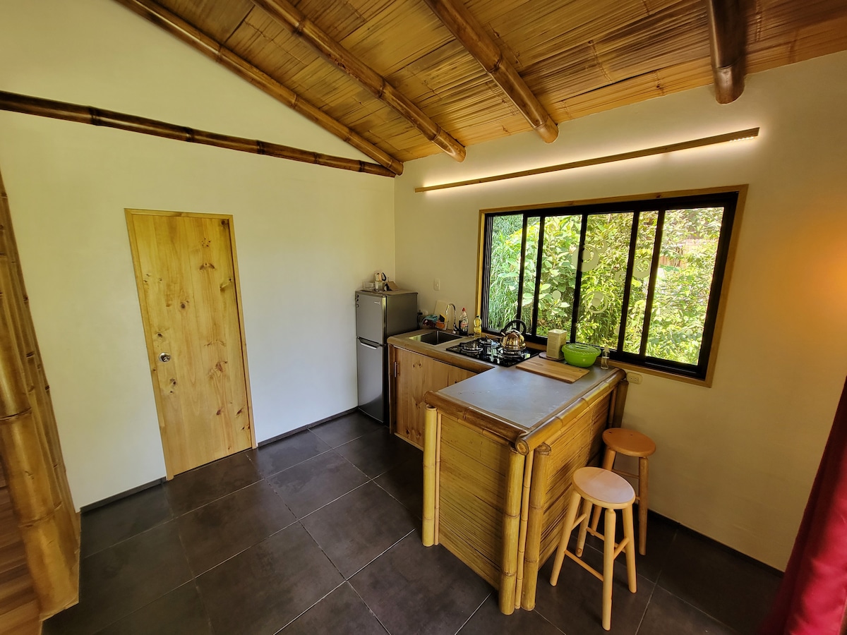 Cabane en bambou fabriquée à la main pour deux personnes, avec jardin privé, cuisine entièrement équipée et douche à eau chaude. Climatiseur et ventilateur de plafond. La propriété est très calme et paisible en bordure de forêt. Idéale pour les personnes qui veulent s'en éloigner et profiter de la nature loin de l'agitation touristique, mais elle est toujours proche des magasins de base (5 min) et des plages, à 10 min en voiture. Il y a une autre maison de location sur la même propriété, pour 4 personnes maximum, mais les deux endroits bénéficient de leurs propres espaces privés.