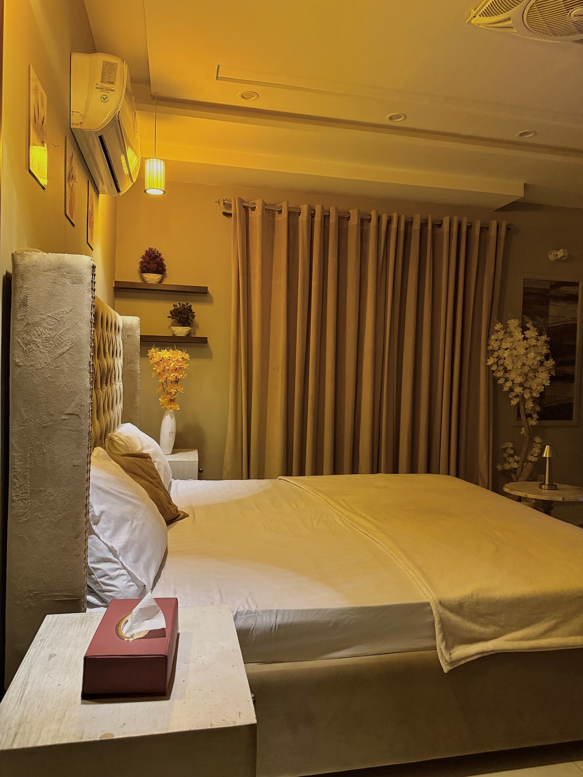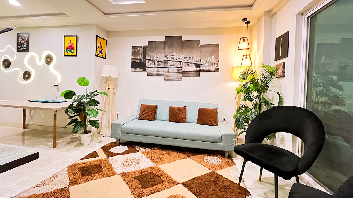Bienvenue à The Aura Stays — comme à la maison, mais en mieux. Studio moderne et confortable avec un lit King Size, des sièges en cuir, une télévision connectée avec Netflix et une connexion Wi-Fi rapide. Profitez d'une vue imprenable, d'un éclairage doux et d'un décor élégant. Comprend une kitchenette compacte avec bouilloire et une salle de bain propre et moderne. Situé dans un immeuble sécurisé au cœur de Bahria Town, à proximité des cafés, des parcs et des sites emblématiques. Parfait pour les voyageurs en solo, les couples mariés ou les séjours d'affaires. Réservez maintenant pour profiter de confort, d'élégance et de tranquillité.