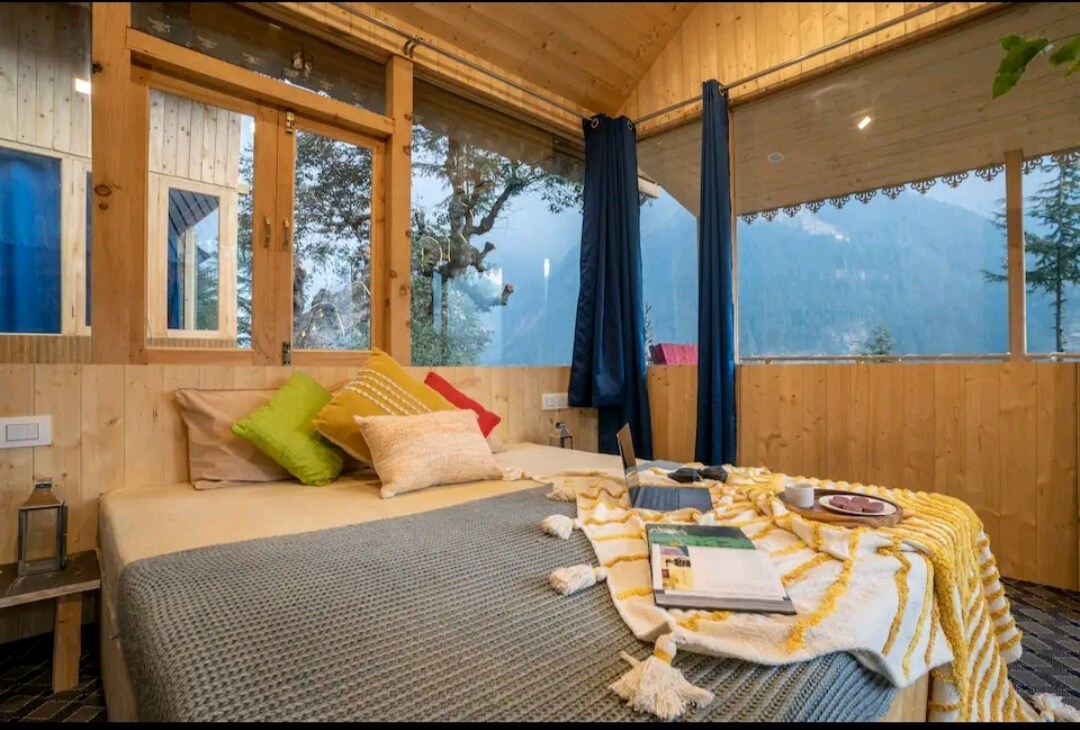 You'll love this unique and romantic escape in Jibhi Valley. Our Spacious and Lavish treehouse offers comfort of modern amenities and joy of nature. ★ Wooden & Glass Architecture ★ Panoramic view ★ Scenic Location ★ Wi-Fi ★ Power Backup ★ Food service ★ Bonfire area ★ Parking at property Please note, Breakfast, Room heaters, Bonfire & other services are exclusive of stay price.