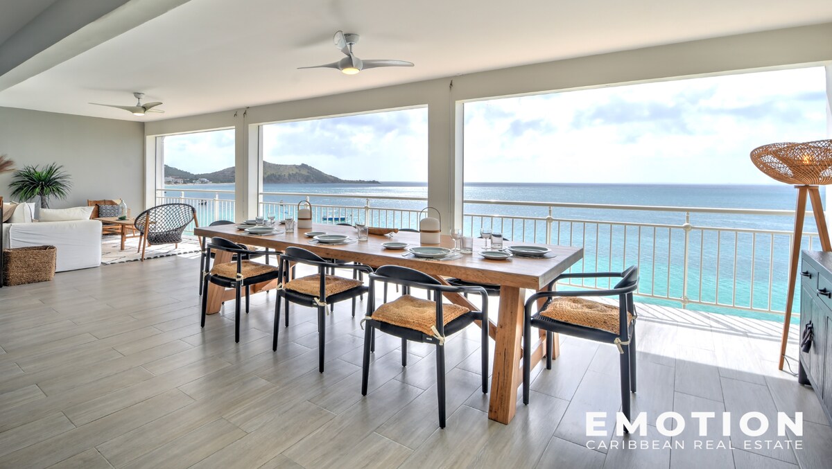 Un loft exceptionnel en bord de mer sur Grand Case Beach, offrant une vue majestueuse sur l'océan et une position de choix au-dessus de l'emblématique Rainbow Café. En haute saison, une atmosphère élégante et tendance donne le ton jusqu'à environ 23 h. Les transats peuvent être réservés directement ou par notre intermédiaire, mais les voyageurs qui réservent avec notre aide bénéficient de touches privilégiées. Une retraite lumineuse et sophistiquée à quelques pas des meilleurs lieux de Grand Case.