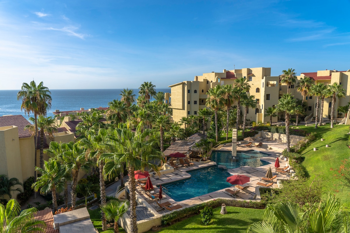 The condo's 180º view lets you enjoy sunrise and sunset at the Cabo Arch from your breakfast-dinner table! Terrace design offers intimacy and escape. Ideal for a romantic stay, home office with paradise views, BBQ dinners with sunset vistas, relaxing hammock siestas, whale-watching while cooking, and sunrise views from bed! Walking access to Cabo's top two beaches and next to The Cape and Thompson Hotel. Please remember, this is a rental condo, not a hotel, and the price reflects that.