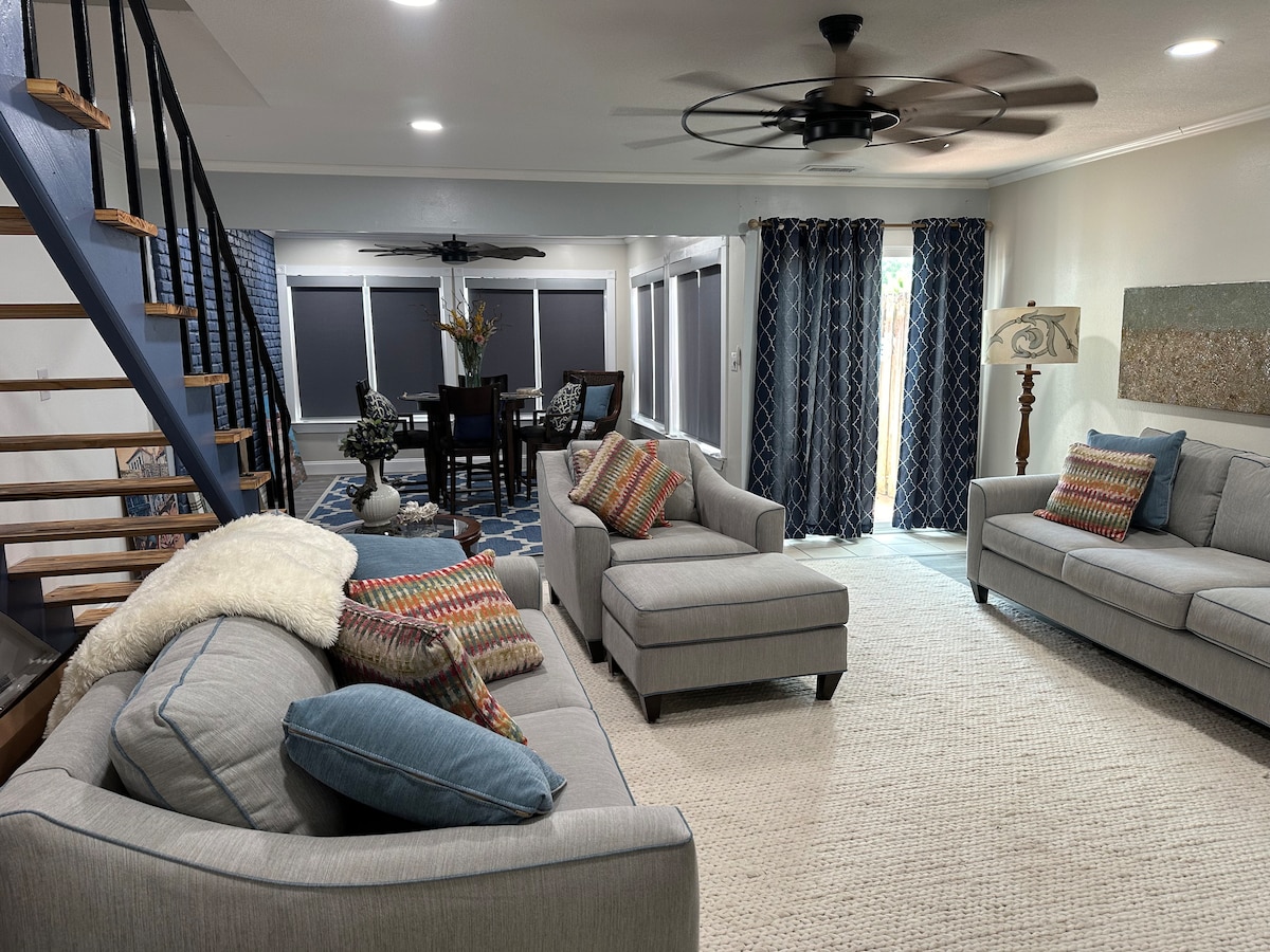 Séjournez dans votre propre oasis au-dessus du magnifique quartier français de Fairhope, entouré de terrains luxuriants et de décorations saisonnières. Profitez de votre douche à l'italienne luxueuse, de lits confortables, d'une cuisine entièrement équipée et d'une buanderie privée. Détendez-vous sur votre balcon spacieux et enveloppant. Promenez-vous jusqu'aux commerces et restaurants du centre-ville qui définissent Fairhope. Admirez des couchers de soleil spectaculaires à quelques pas seulement de la jetée de Fairhope. Regardez les défilés du Mardi Gras depuis le balcon ou ayez une base pratique pendant les Arts and Crafts.