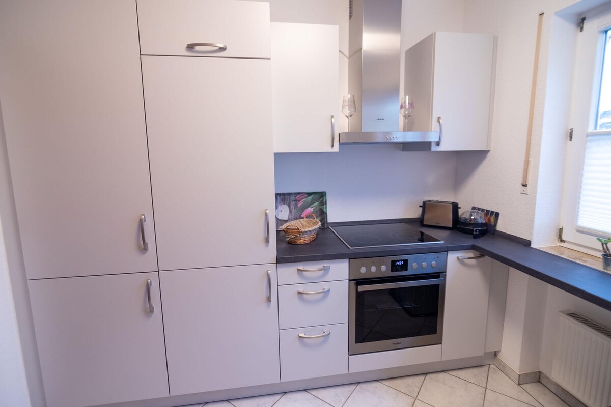 🌷Bienvenue 🌷 Dans notre petit logement privé dans la zone industrielle ! Au-dessus de notre entreprise, une petite oasis de bien-être vous attend - idéale pour les couples qui recherchent la détente. Profitez de la vue magnifique depuis le jacuzzi. Les fenêtres coulissantes peuvent toutes être complètement ouvertes. Laissez la vie quotidienne derrière vous et profitez du temps à deux 🥂 * Veuillez noter que la connexion Internet n'est pas très stable en ce moment *