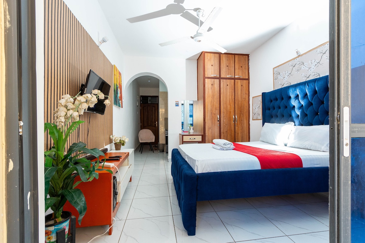 Reposez-vous et détendez-vous à l'intérieur comme à l'extérieur dans une maison privée. La maison est à 15 minutes à pied et à 5 minutes en voiture de la plage de Nyali. - Dispose d'un lit double. - Écran plat et Wi-Fi gratuit - Placard équipé de cintres et de tiroirs + boîte à fer. - Cuisine bien équipée. - Salle de bain spacieuse et propre Le studio est une maison d'hôtes privée indépendante au fond de la propriété. Il y a 3 maisons dans le complexe ; les voyageurs auront leur intimité et leur espace d'entrée et de jardin.