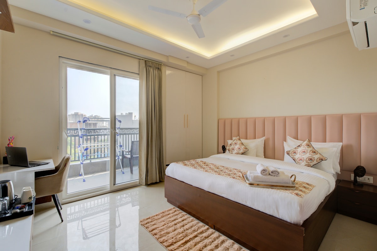 Un séjour privé calme et soigneusement conçu avec accès à la terrasse et au jardin, parfait pour les voyageurs en solo, les professionnels et les couples. Wifi ✔️ rapide et espace de travail dédié ✔️ Lit confortable et salle de bain privée propre ✔️ Cuisine entièrement équipée ✔️ Quartier résidentiel calme, mais central 📍Route du terrain de golf Métro le plus proche : Secteur 55–56 Rapid ⏱ Distances clés : • Romeo Lane : 2 minutes • Cyber Hub : 15 minutes • Medanta : 15 minutes • Aéroport IGI – 40 minutes 🌿 Terrasse ouverte Avec un 🚗 stationnement