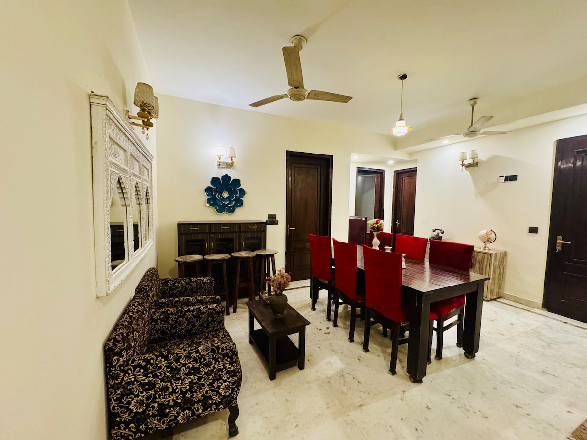 Chez « H is for Home », nous proposons un appartement privé de 3 chambres/3 salles de bains, spectaculairement ensoleillé, avec une décoration élégante et des équipements de service complets au cœur de Delhi. Il est situé dans un immeuble sécurisé et fermé. Délicieux petit-déjeuner fait maison, thé/café inclus. Nous fournissons un service de voiture + chauffeur pour les transferts aéroport, à Delhi/NCR et les voyages à Agra/Jaipur. L'unité est située au 3e étage avec accès par ascenseur moderne. Toutes les fenêtres ont des grilles et nous offrons le wifi Jio Fiber super rapide.