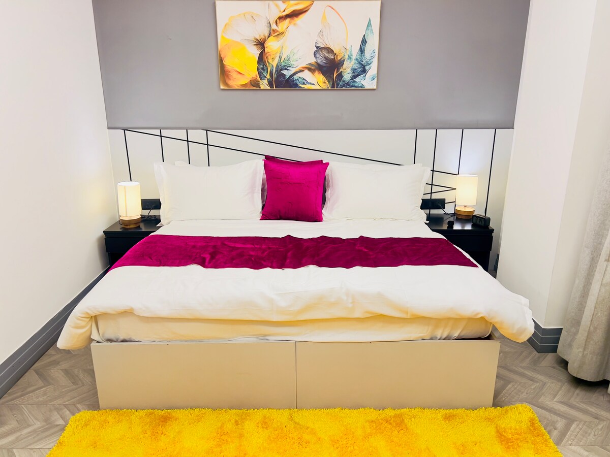 Détendez-vous dans cet appartement de luxe de 2 chambres situé au centre avec un grand balcon offrant une vue panoramique sur la ligne d'horizon de Ggn et offrant la bonne quantité de tranquillité dont votre esprit et votre corps ont besoin au milieu de la routine quotidienne. Situé dans un complexe fermé avec sécurité 24h/24 et 7j/7. La station de métro, quelques points de restauration incroyables, les centres commerciaux, Cybercity, Golf course road et surtout les pubs sont à deux pas de cet endroit. Ménage quotidien pour vous assurer un séjour confortable.