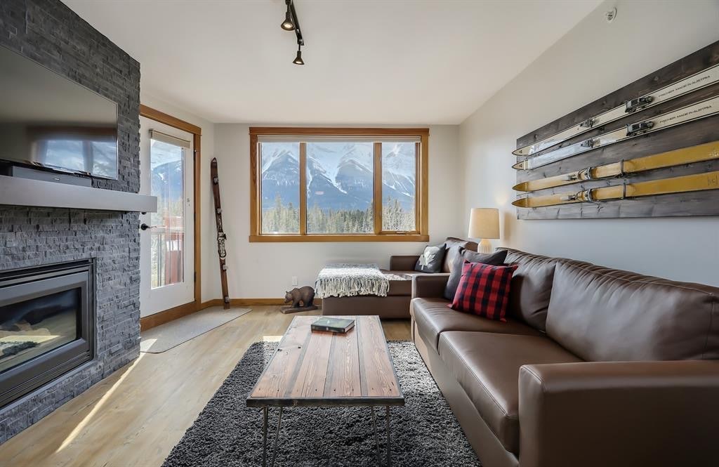 Donnant sur la magnifique montagne Rocheuse depuis le balcon, la chambre et le séjour, ce nouveau condo d'une chambre récemment rénové vous offre toutes les commodités que vous attendez. La chambre dispose d'un lit King Size confortable. Dans le séjour, il y a un canapé convertible de haute qualité pour accueillir des voyageurs supplémentaires. La cheminée offre une ambiance chaleureuse. Wi-Fi gratuit et télévision connectée avec Amazon Prime Video et Shaw TV pour vos loisirs. Cuisine entièrement équipée et baignoire profonde avec douche pour que vous vous sentiez comme chez vous !